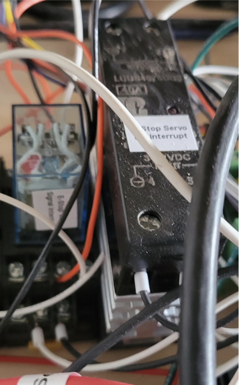 In theory, pressing the E-stop button should immediately halt servos and start spinning down VFD. But in practice (and as warned in Masso documentation), there is occasionally a delay that can cause the CNC to continue cutting, and / or only one of the two high power devices gets the signal. So we need to cut power to devices more directly using the TTL output from the controller to disconnect the spindle signal from the Masso controller (to allow a controlled spindle spin down) and Teknic DC servo bus (so all servos go into a free hold state instantly).