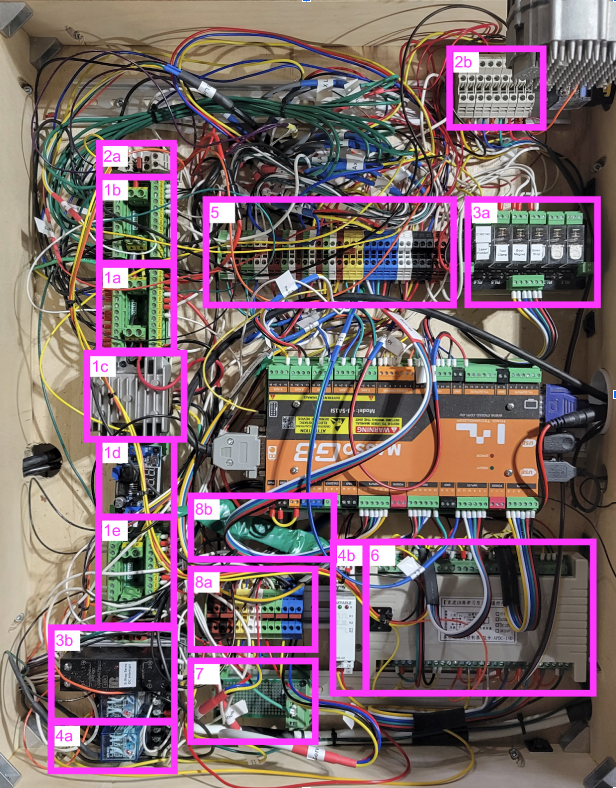 If you’re interested in the nitty gritty: 1) Power distribution; 24V supply under table; 1A. 24V power distribution, not current limited (i.e.: relays, solenoids, electromagnets); 1B. 24V current-limited (fed by 1a) current-limited to reduce risk of fatal (to electronics) short circuits, for electrical control signals; 1C. 12V buck converter (for pneumatics relays & e-stop relays); 1D. 5V digital converter (for laser pointer); 1E. 12V power distribution; 2) Signal distribution block; 3A. 6-signal TTL relay for e-stop, laser, tool clamp, and dust boot; 3B. E-stop relays to sever power to spindle & servos when e-stop button pressed; 4) Pneumatics VFD-triggered relays; 4A. Mechatron tool changer positive pressure relay, on when VFD has power; 4B. Latching relay triggered by remote control to turn on / off dust-clearing air blast; 5) Signal distribution, to allow me to organize & group the long wire runs that route to the CNC from the shorter wires within the electrical panel.; 6) Remote control relay block, with an 18-button remote and 18 individual SPDT relays; 7) Touch probe wiring / in-line resistor; 8) Power monitoring; 8A. Power monitoring signal distribution; 8B. Shunt resistor for DC current monitoring